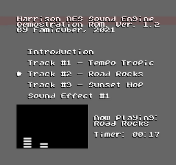 Hey there! Thank you for checking out this demo ROM of the Harrison Sound Engine for NES, the music tracks and sound effects included were all original and made with this sound engine, It was a one guy project that took nine months to develop between two revisions. I'm now looking for the engine to be used in projects either from mine, or other variety of NES homebrew programmers.